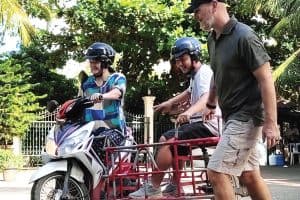 Driving lessons. A sidecar added to a school motorbike allows students to collect and distribute supplies.