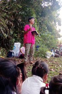 “Saw Pah” gives the closing prayer at his jungle school’s end-of-year celebration.