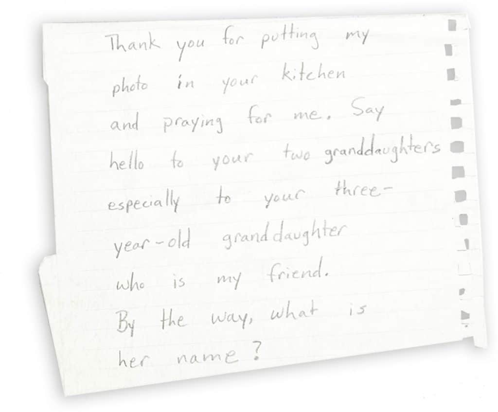 “Thank you for your lovely letter. I’m so happy to write you. Firstly, let me tell you more about myself. I’m 12 years old. My favorite subject is science. I have bone cancer. Please keep praying for me and my sick father. Thank you for putting my photo in your kitchen and praying for me. Say hello to your two granddaughters, especially to your three-year-old granddaughter who is my friend. By the way, what is her name?”